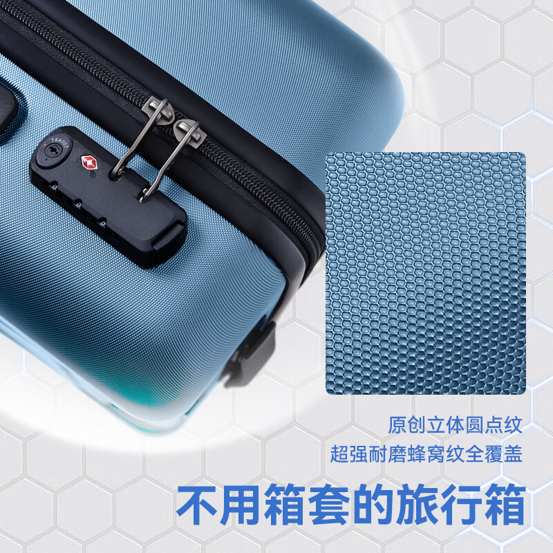 4、到货速度快。外包装完好无损。万向轮滚动流畅。买完迫不及待的就用上了。走在路面上不卡顿。挺好的。箱子的表面有耐磨的暗花纹。