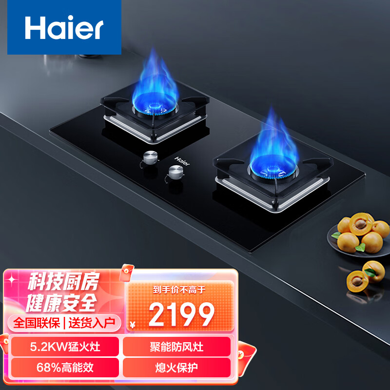 海尔(Haier)JZT-Q2BE8(T) 燃气灶 5.2KW大火力 嵌入式 双眼灶 一级能效 天然气灶 台式灶价格:2199.00元!