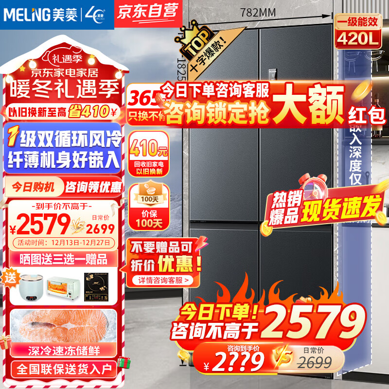 美菱【离子净】420升十字对开四门家用风冷无霜冰箱低噪节能一级双变频双循环系统 BCD-420WP9CX典雅灰价格:2699.00元!
