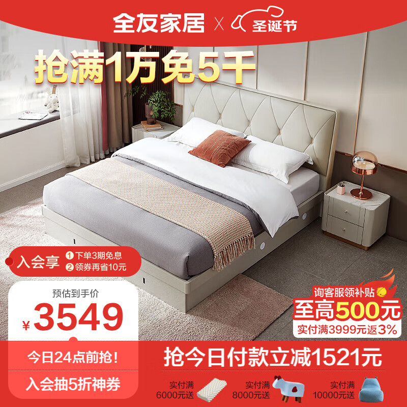 全友家居 床 轻奢欧皮软床主卧实木床屏边框高箱储物床127801 1.5m带抽高箱床+床头柜*1+105169Ⅱ床垫价格:5070.00元!