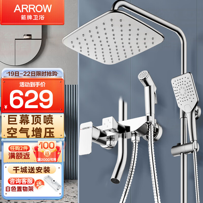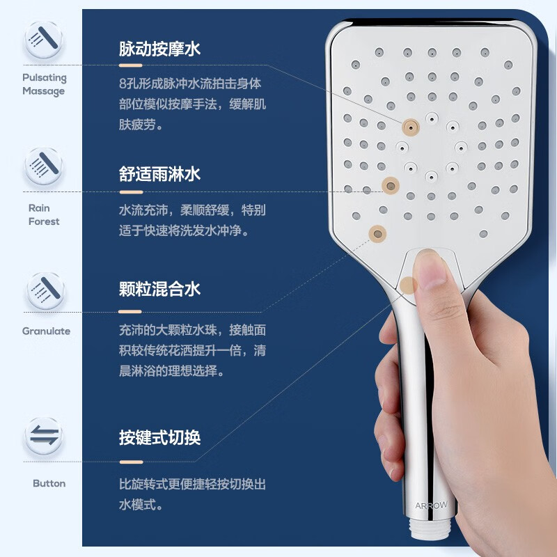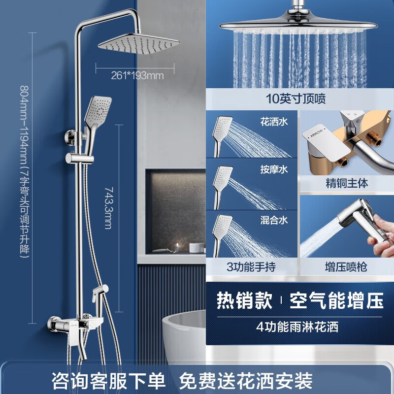 箭牌(ARROW) 淋浴花洒套装铜龙头沐浴家用浴室淋雨喷头顶喷花洒冷热淋浴喷头 【E款】空气能增压四功能花洒价格:1129.00元!