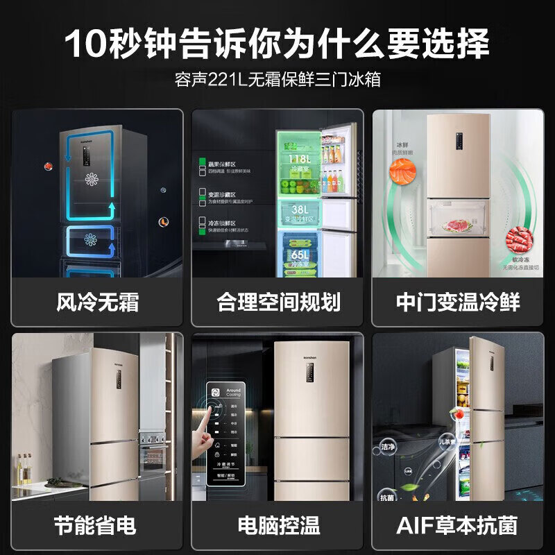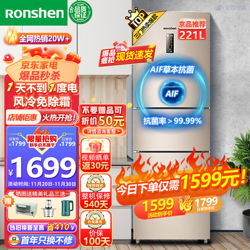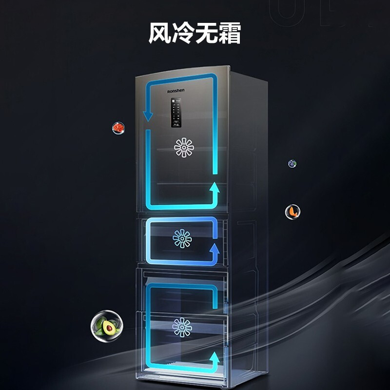 容声(Ronshen) 221升三门风冷无霜冰箱家用节能电脑控温三开门电冰箱价格:1549.00元!
