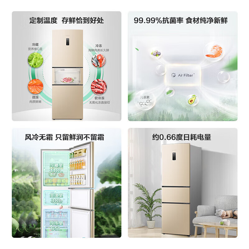 2、外形外观:简约时尚制冷效果:目前使用情况不错,风冷无霜,方便清洁保鲜效果:三门设计,便于分类储存容量大小:一家三口使用刚合适