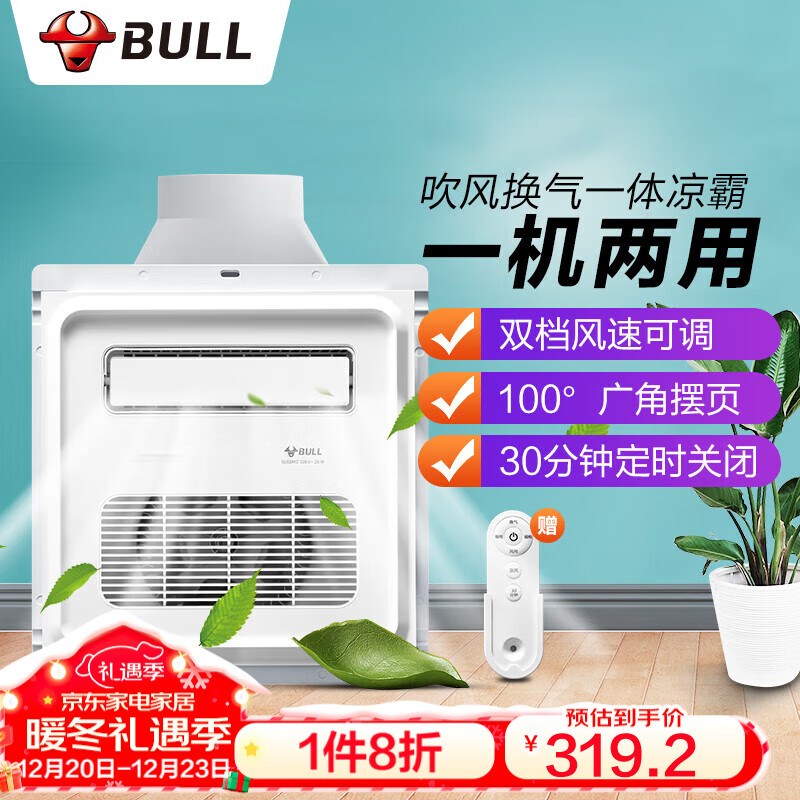 公牛(BULL)凉霸厨房卫生间GL02AYZ 【2档吹风换气 红外遥控定时关闭】价格:399.00元!