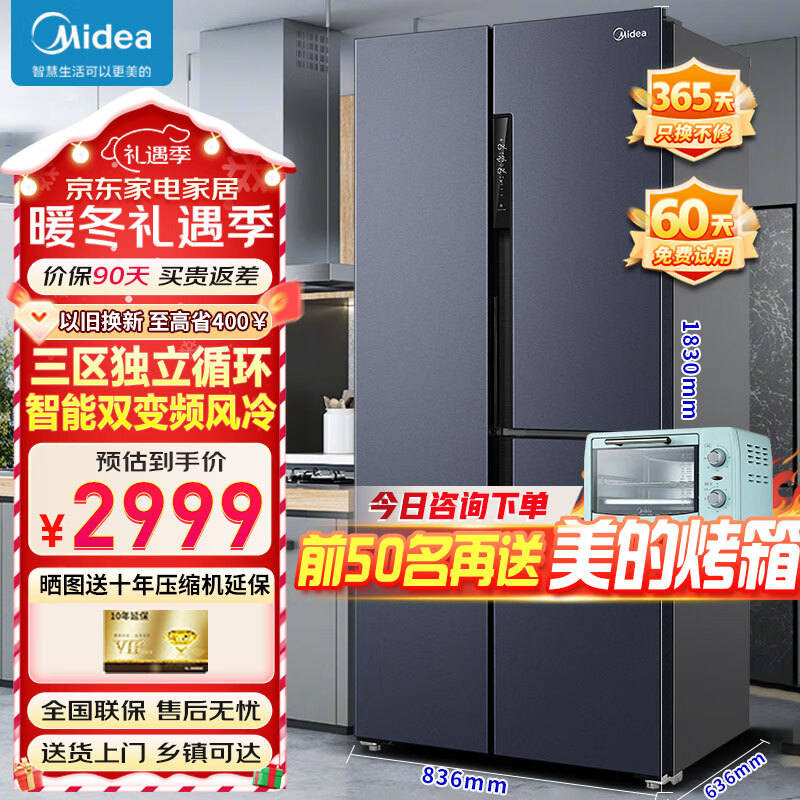 美的(Midea)443升对开门T型三开门多门电冰箱家用三温分储双变频风冷无霜PT净味超薄大容量BCD-443WKPZM(E)价格:2999.00元!