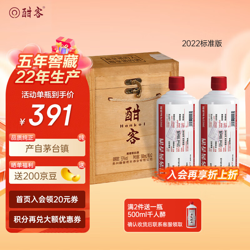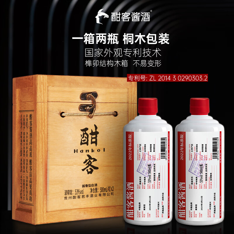 酣客 2022年标准版 酱香型白酒53度坤沙大曲 500ml*2瓶 木箱礼盒装价格:869.00元!