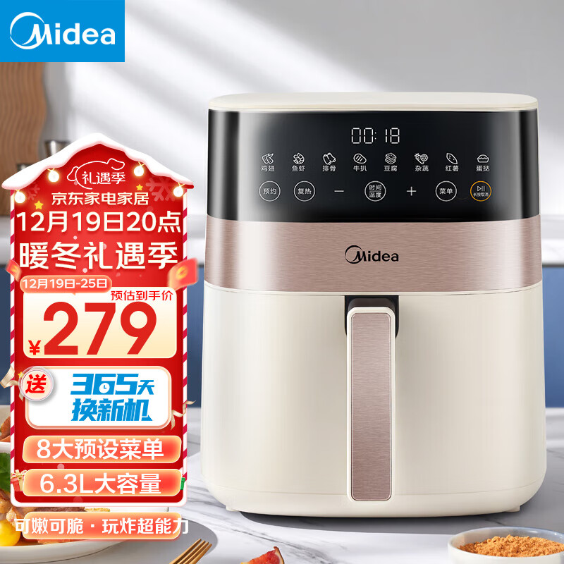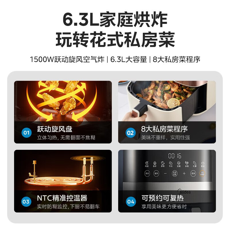 美的(Midea) 空气炸锅低油 6.3升大容量 家用全自动智能触屏新款多功能电气炸锅空气炸烤箱薯条机 【跃动烤盘】不用翻面价格:509.00元!