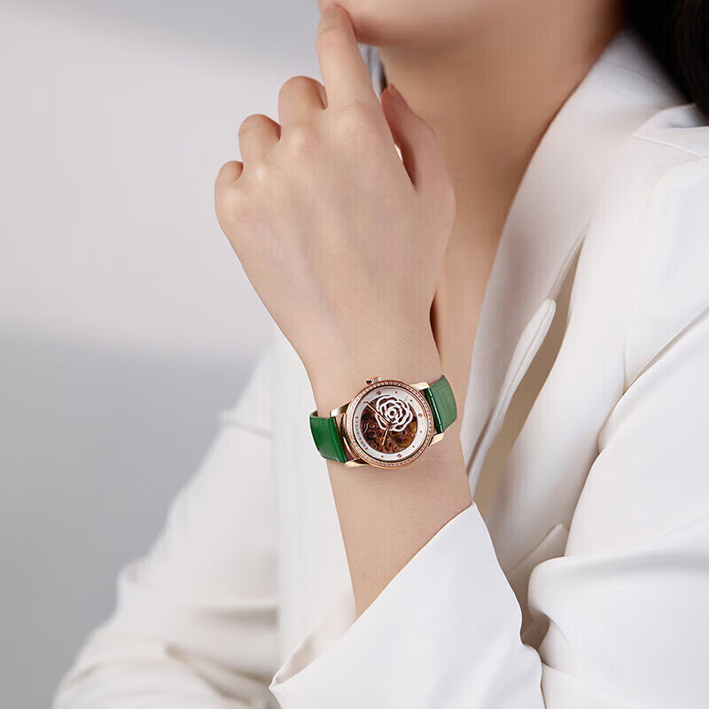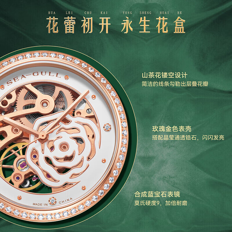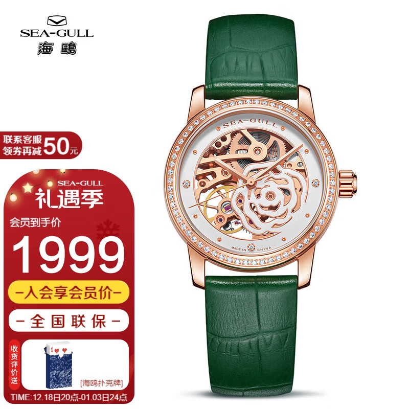 海鸥(SEAGULL)手表女士自动机械表 女表送女友礼物 山茶花镂空腕表 山茶绿价格:2299.00元!