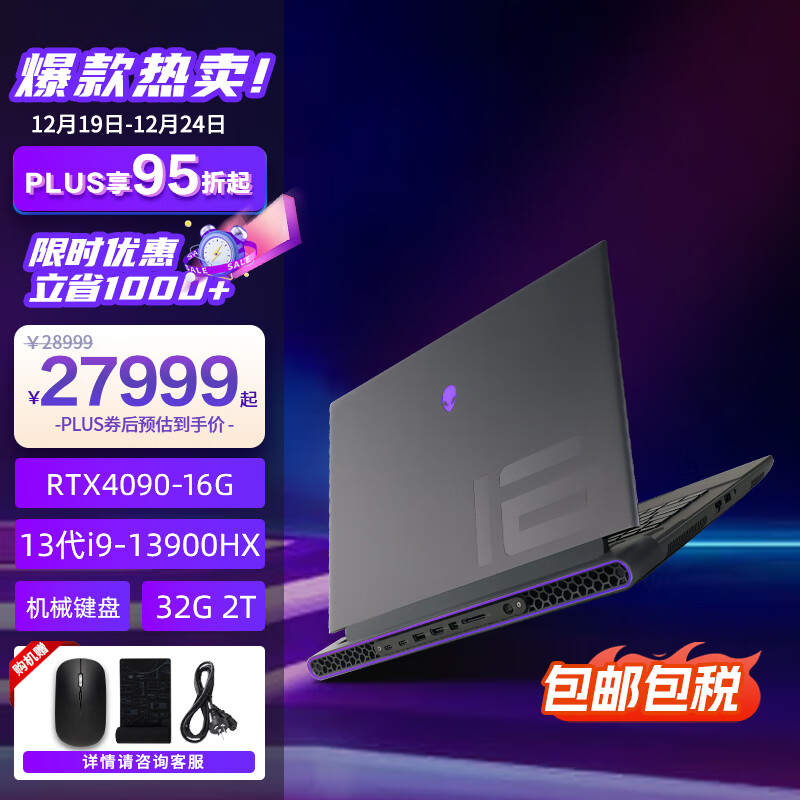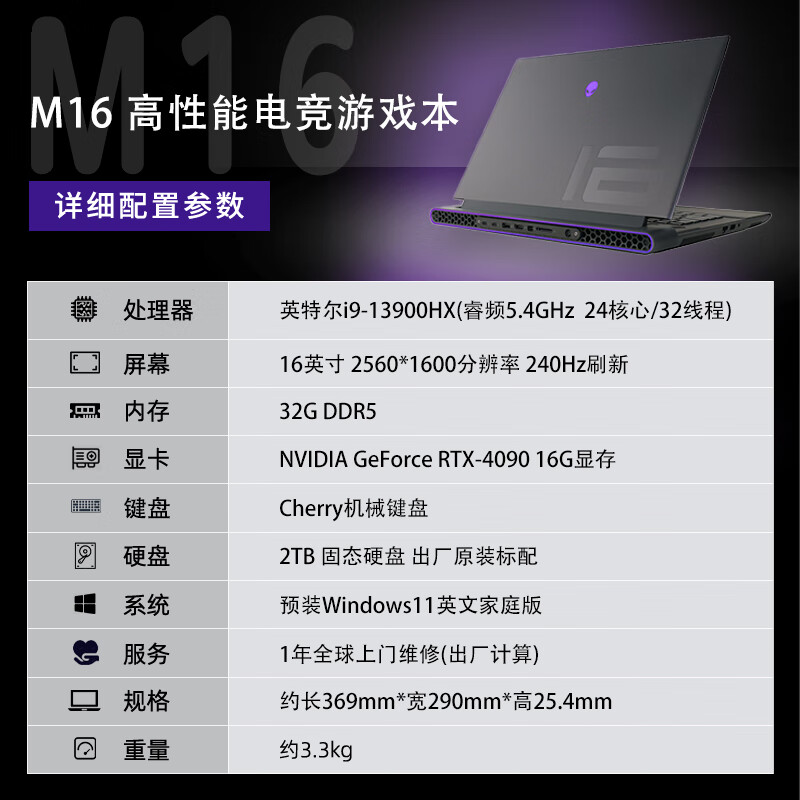 外星人(Alienware)全新M16 R1 高端电竞游戏本笔记本电脑 13代i9-13900HX RTX4090 32G 2T 2560x1600-240HZ 机械键盘价格:28999.00元!