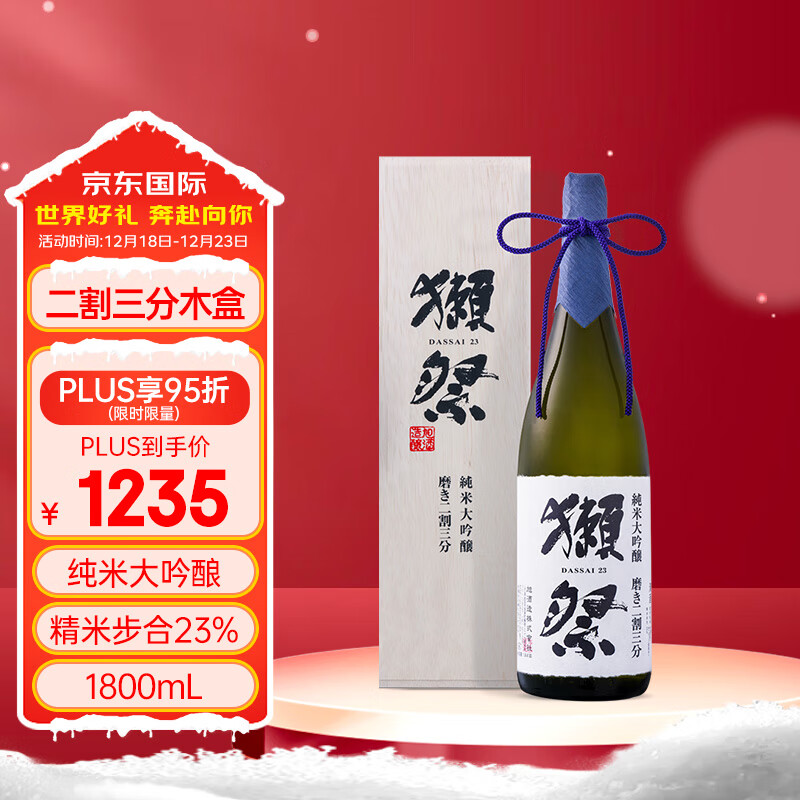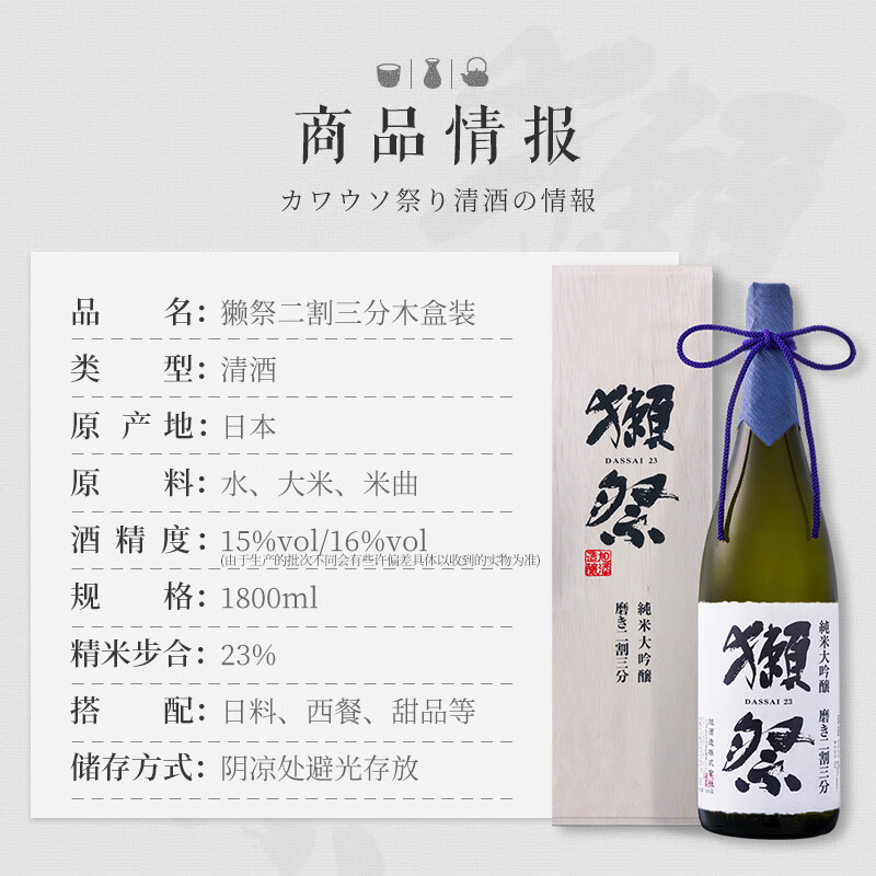 獭祭(Dassai)23二割三分 日本清酒 1.8L木盒装 纯米大吟酿价格:1300.00元!