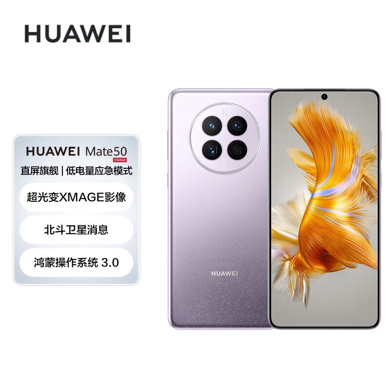 HUAWEI Mate 50 直屏旗舰 超光变XMAGE影像 北斗卫星消息 低电量应急模式 512GB流光紫华为鸿蒙手机价格:5899.00元!