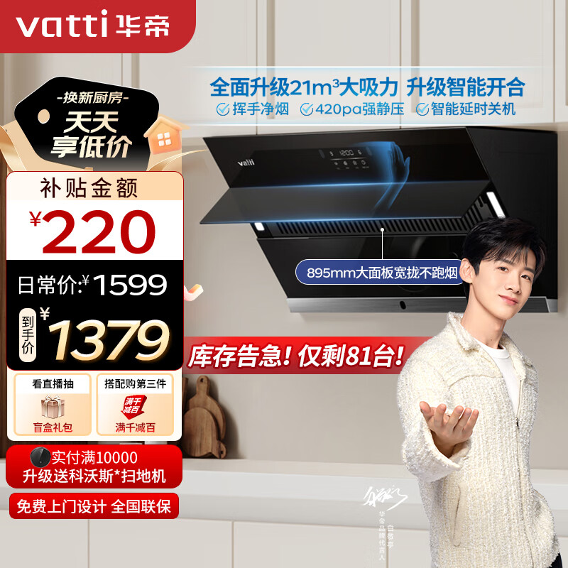 华帝(VATTI) 抽油烟机侧吸式家用吸油烟机小尺寸自动开合 21风量瞬吸大吸力脱排油烟机 i11127S价格:1379.00元!