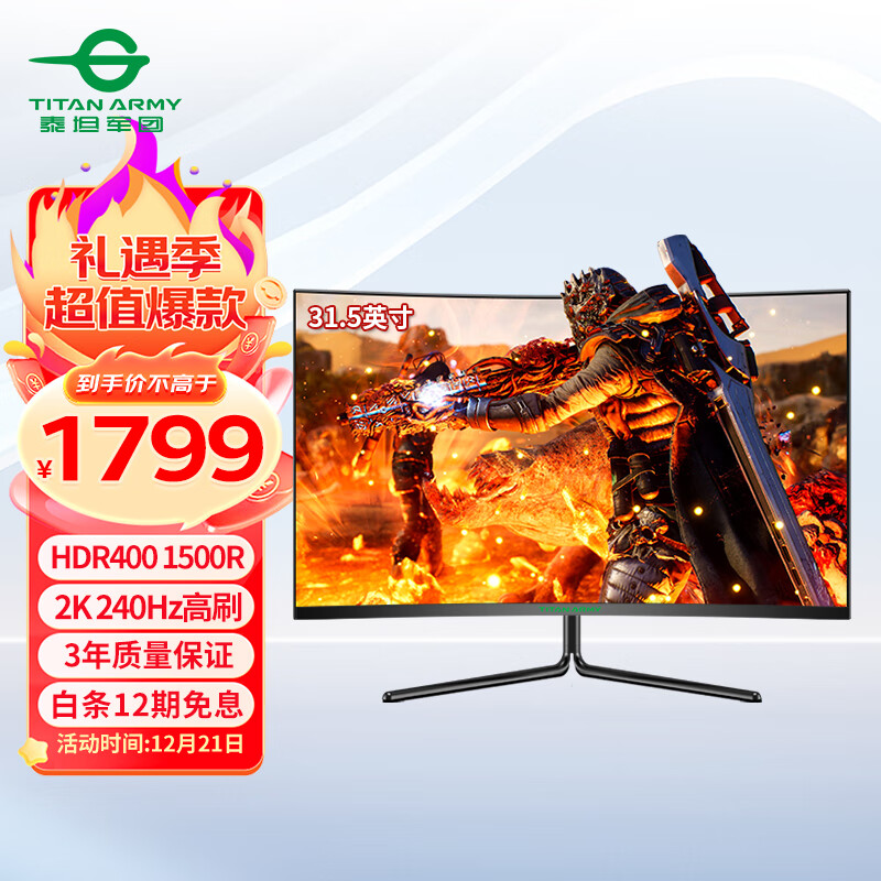 泰坦军团31.5英寸 2K 240Hz曲面显示器 HDR400广色域 电竞HVA 1500R精妙曲率 A-Sync技术 电脑显示屏 C32C1S价格:1999.00元!