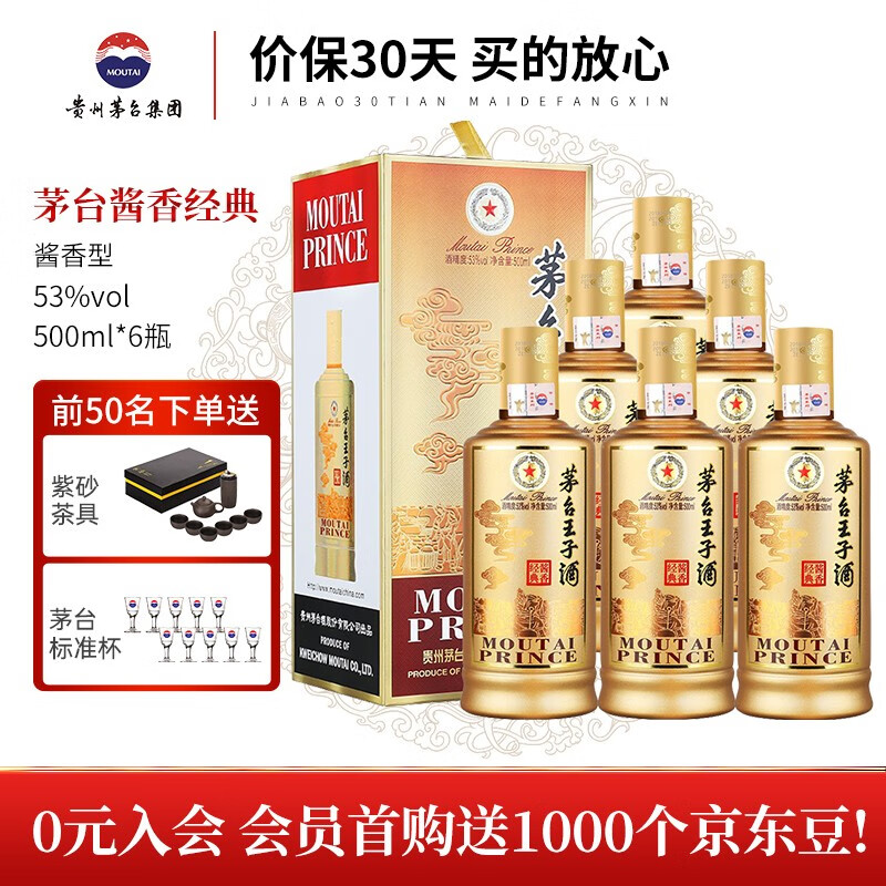 茅台(MOUTAI)王子酒酱香型白酒 迎宾送礼酒水 整箱 53度 500mL 6瓶 酱香经典价格:2808.00元!