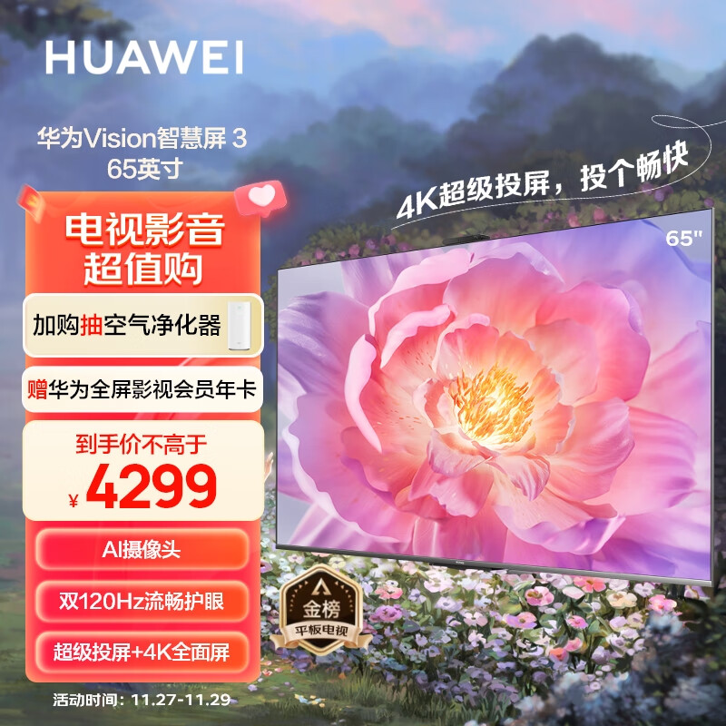 华为(HUAWEI)Vision智慧屏 3 65英寸 超薄屏4K超高清 240Hz鸿鹄画质 AI摄像头 智能液晶护眼电视机HD65QINA价格:4299.00元!