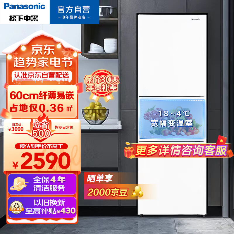 松下(Panasonic)磨砂白色270升家用三门冰箱 60cm超薄小 自由嵌入式 风冷无霜NR-EC27WPB-W价格:2590.00元!