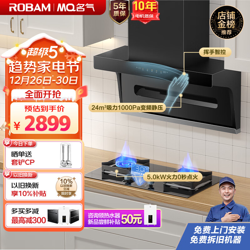 名气(MQ)老板抽油烟机7字型家用顶侧双吸变频油烟机家用24大吸力1000Pa变频烟灶套装双天然气A5508+6820BT价格:2899.00元!