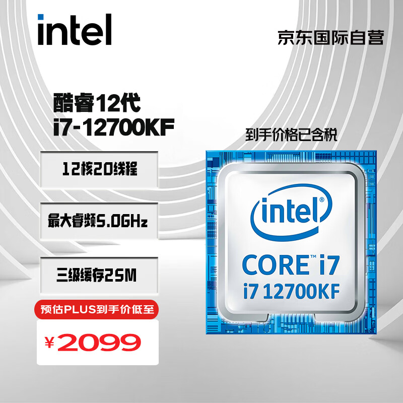 英特尔(Intel) i7-12700KF 酷睿12代 处理器 12核20线程 单核睿频至高可达5.0Ghz 25M三级缓存 台式机CPU价格:2209.00元!