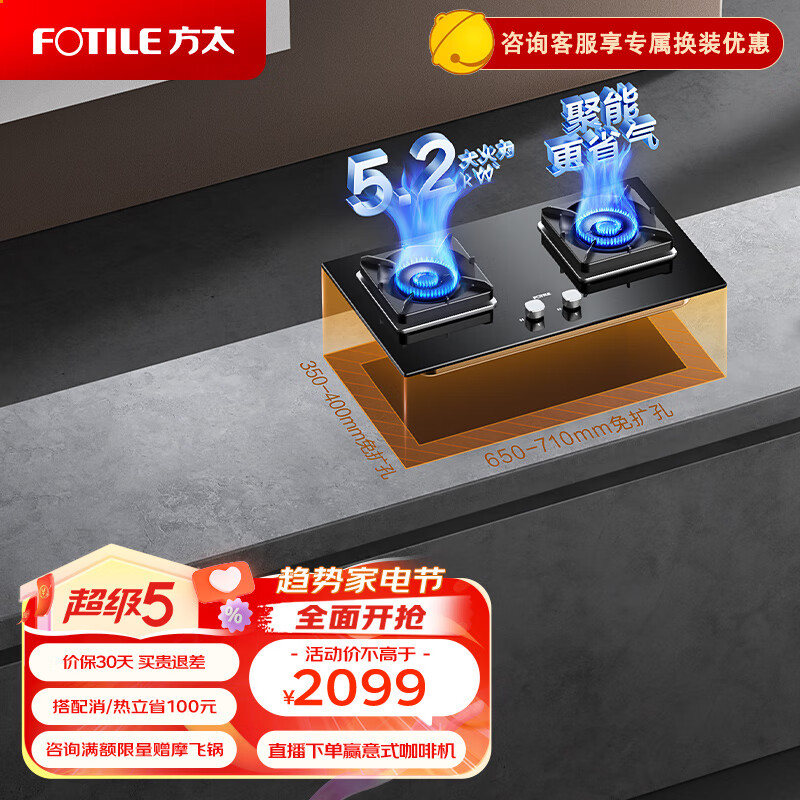 方太燃气灶(天然气)家用嵌入式猛火双灶台灶具 5.2kW*大火力 可调节底盘 JZT-02-TH27B价格:2099.00元!