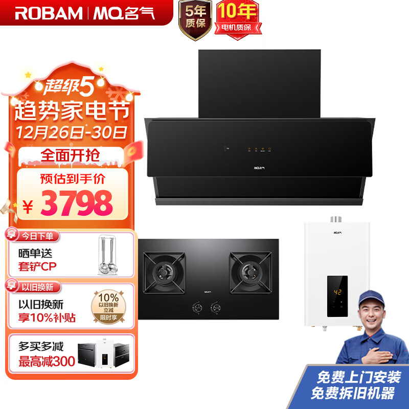 名气(MQ)老板抽油烟机侧吸变频油烟机烟灶套装家用24吸力960变频静压燃气热水器三件套S1+A6510B++R5A06-14价格:3798.00元!