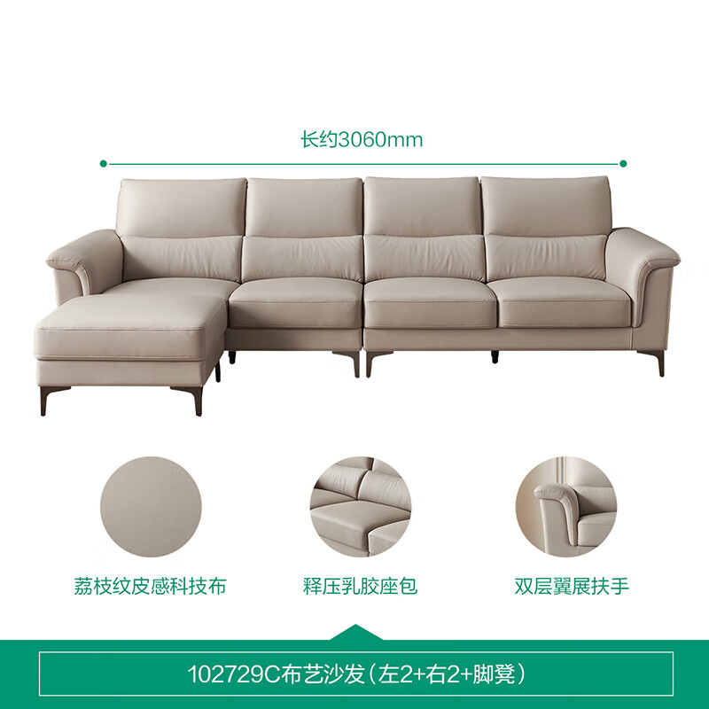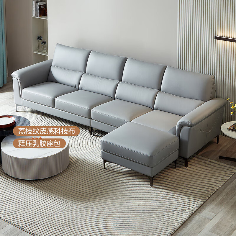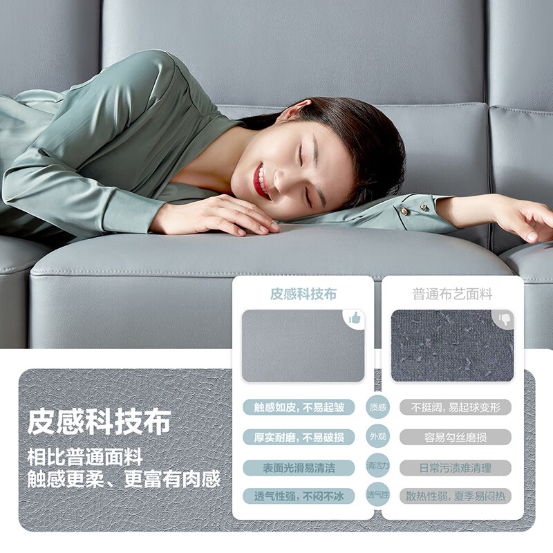 5、沙发做工好,科技布材料质感有头层牛皮的感受,颜色与客厅非常搭配,脚蹬左右自由组合,很方便!家人非常满意!