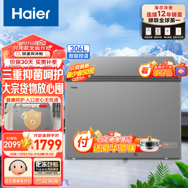 海尔(Haier)306升低霜卧式商用家用冰柜 商用大容量冷藏柜冷冻柜冰柜家用大冷柜BC/BD-306HED以旧换新价格:1799.00元!