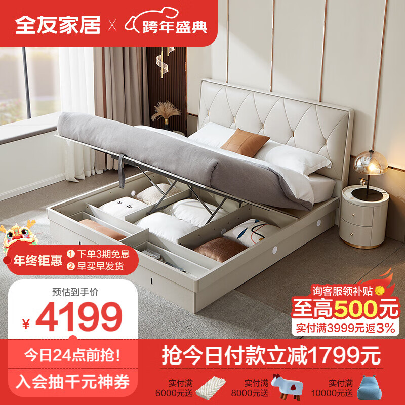 全友家居 床 轻奢欧皮软床主卧实木床屏边框高箱储物床127801 1.5米带抽高箱床+床头柜*2+105169Ⅱ床垫价格:5998.00元!