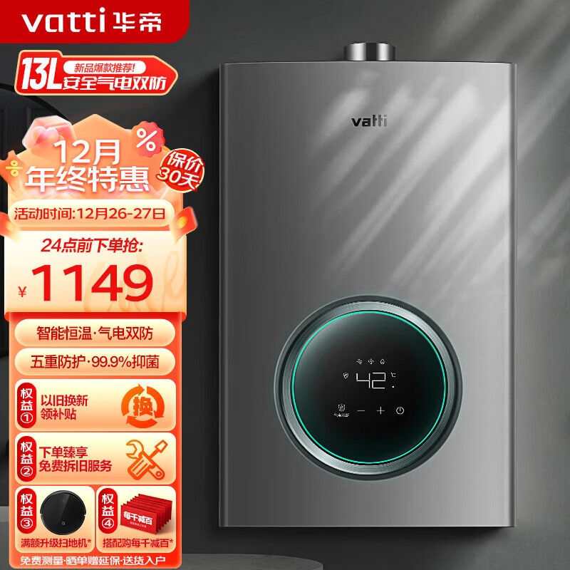 华帝(VATTI)燃气热水器 气电双断防护 恒温强排 即热式热水器 防燃气泄漏保护 低水压启动 【一厨一卫】i12103-13升 天然气价格:1199.00元!