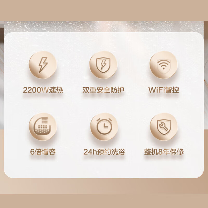 5、外形外观:外观大气,时尚美观。加热速度:加热速度比较快,好用。耗能情况:节电效果也还不错,满意。洗浴时间:洗浴时间长,俩人洗浴足够用。物流也比较快,包装也很好。