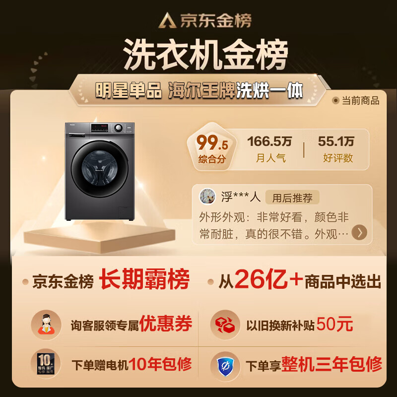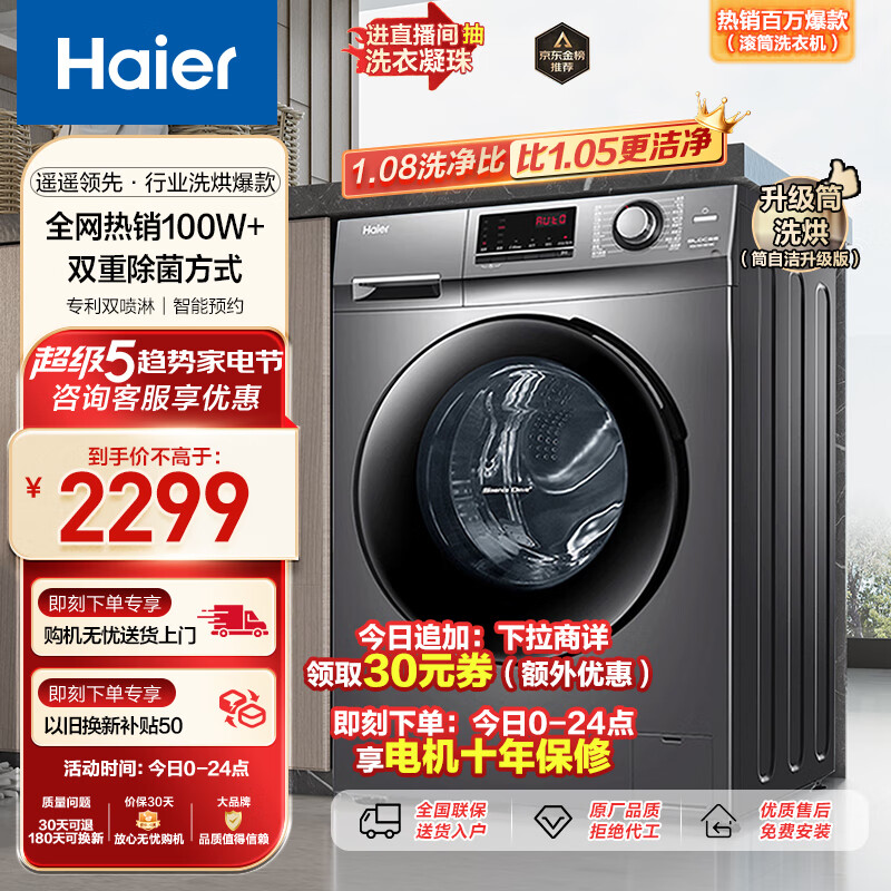 海尔(Haier)滚筒洗衣机全自动洗烘一体机 10公斤大容量 1.08高洗净比 升级筒洗烘 以旧换新 XQG100-HB106C价格:2299.00元!