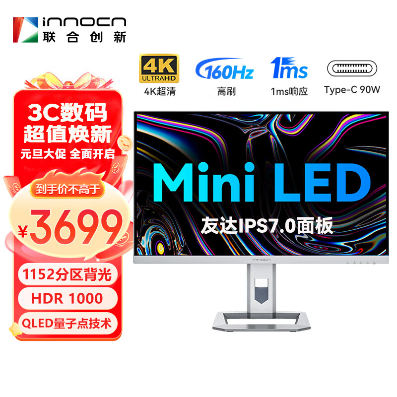 联合创新(INNOCN)27英寸4K 160Hz MiniLED显示器1ms自动感光护眼Type-C90W旋转升降HDR1000电脑显示屏27M2V价格:4999.00元!