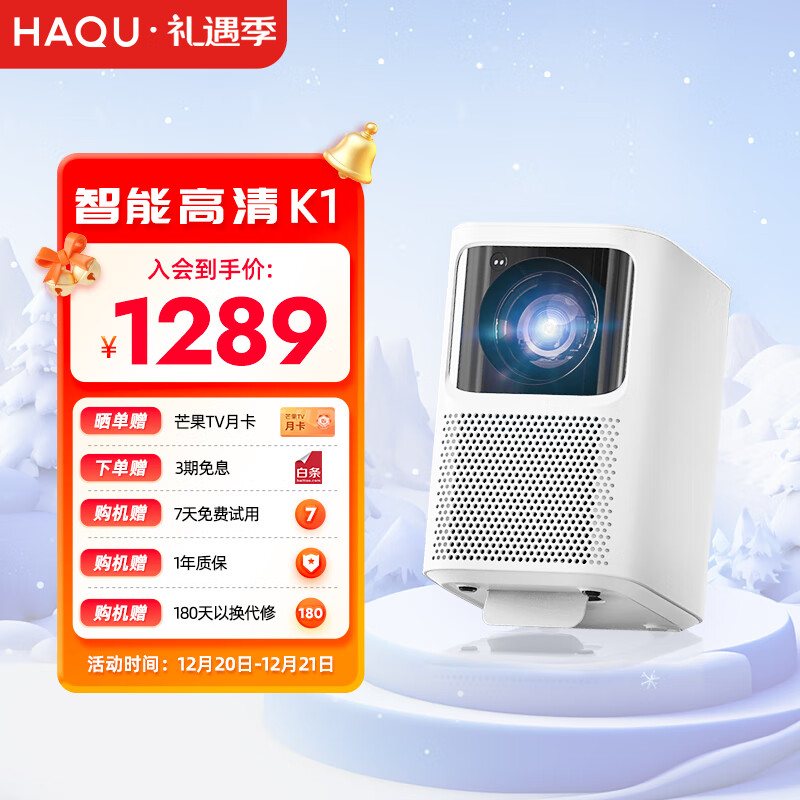 哈趣 K1 全高清智能投影仪家用 卧室投影机(4K解码 真1080P 420 CVIA流明 TOF无感对焦 无感梯形校正)价格:1299.00元!