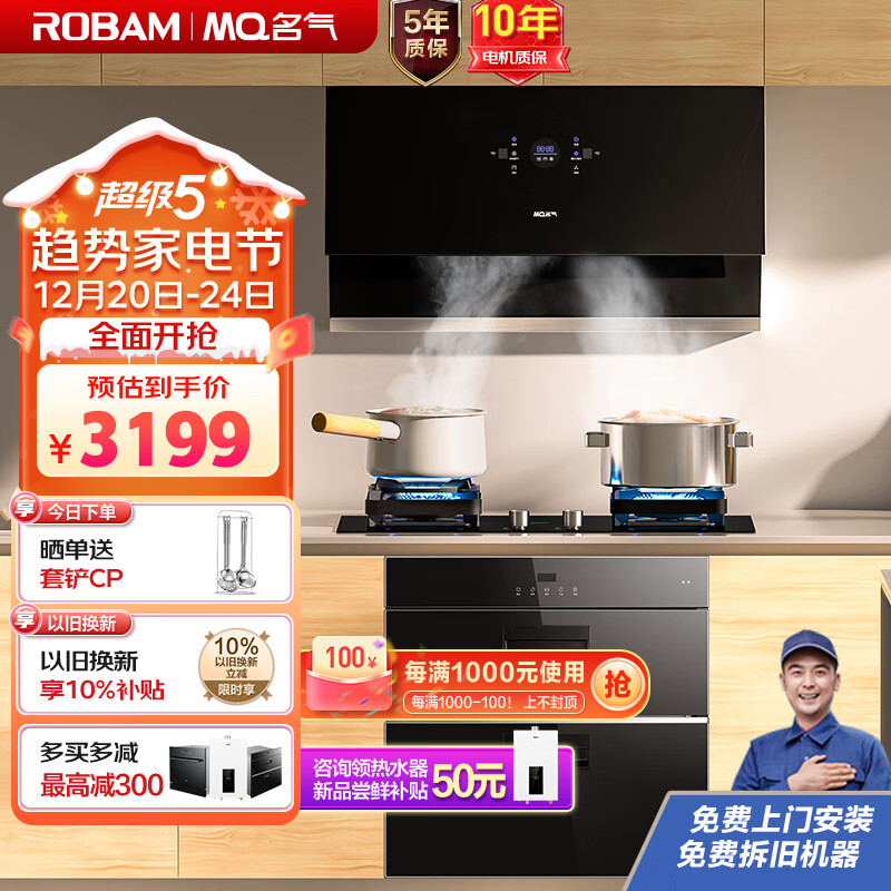 名气(MQ)老板抽油烟机烟灶套装侧吸23吸力风量吸油烟机燃气灶消毒柜家用烟灶消三件套2570A+6510BT+X101A价格:3199.00元!