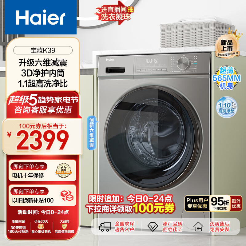 海尔(Haier)【宝藏K39】超薄滚筒洗衣机全自动 10公斤大容量 六维减震 1.10洗净比 3D内筒EG10039S价格:2399.00元!