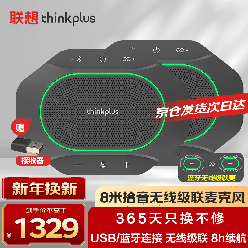 联想thinkplus视频会议全向麦克风8米拾音免驱蓝牙无线级联同收同放适用桌面型扬声器30~80㎡MK-MC600*2价格:1398.00元!