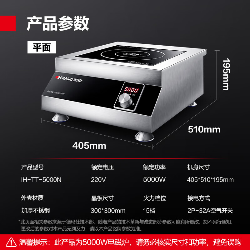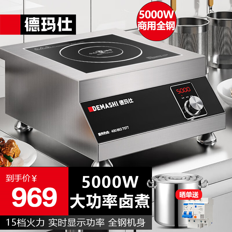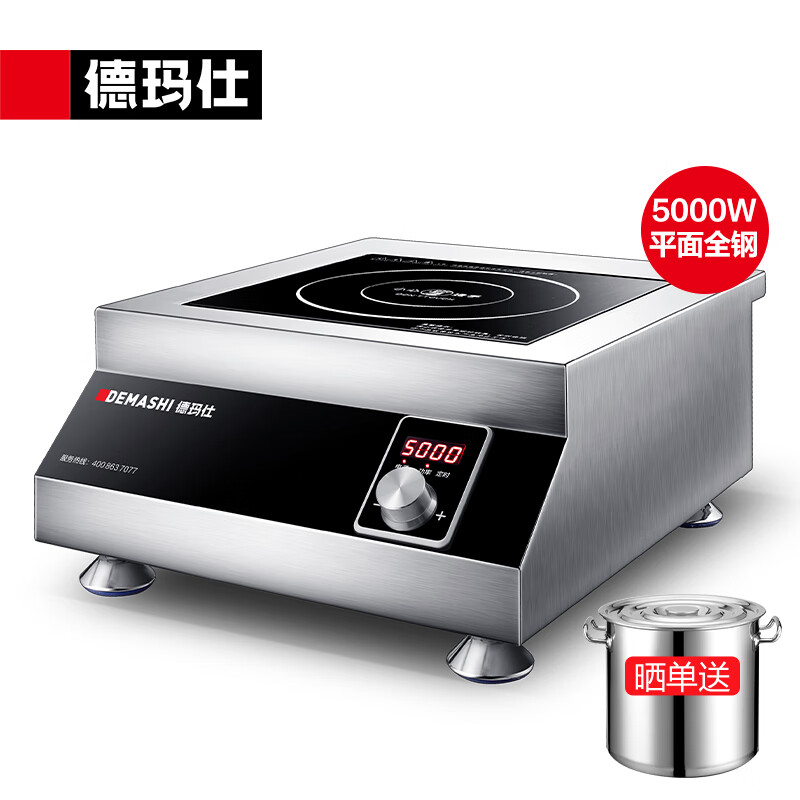 德玛仕(DEMASHI)大功率商用电磁炉5000W商业电磁灶平面爆炒全不锈钢电池炉 5000W加厚不锈钢IH-TT-5000N价格:969.00元!