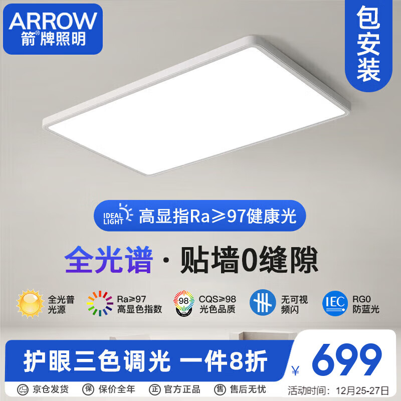 ARROW箭牌照明 全光谱护眼吸顶灯卧室超薄书房儿童房灯中山灯具QC381价格:874.90元!
