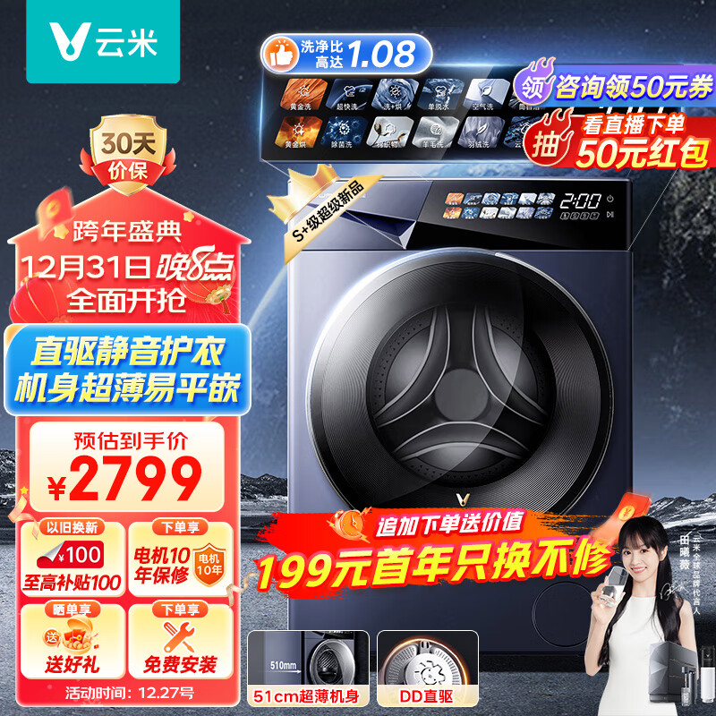 云米(VIOMI)滚筒洗衣机全自动 10公斤 洗烘一体超薄 DD直驱 变频 空气洗 除菌 WD10FA-B1A(厂直)价格:2799.00元!