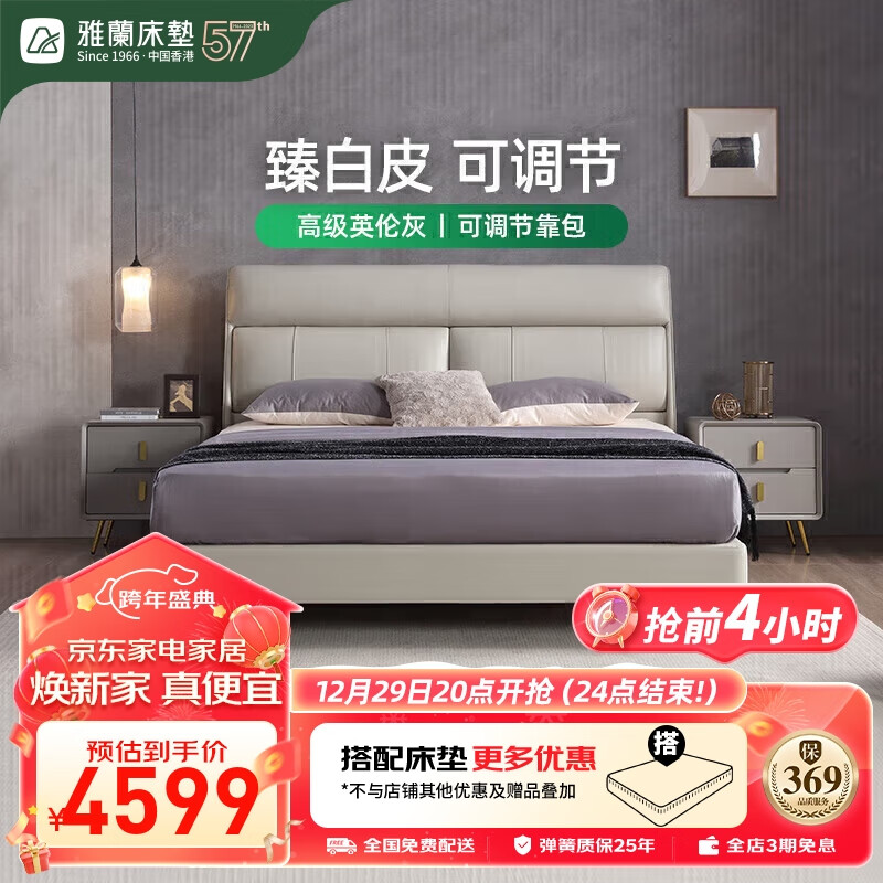 雅兰简约风真皮床主卧靠背可调节双人皮艺床 伯明翰 1.8*2米价格:5599.00元!