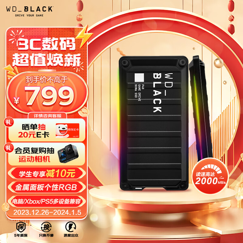 西部数据(WD)1TB NVMe 移动固态硬盘(PSSD)P40 type-c 游戏硬盘ssd外接xbox手机笔记本拓展存储2000MB/s价格:799.00元!