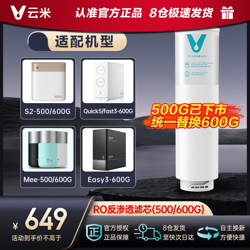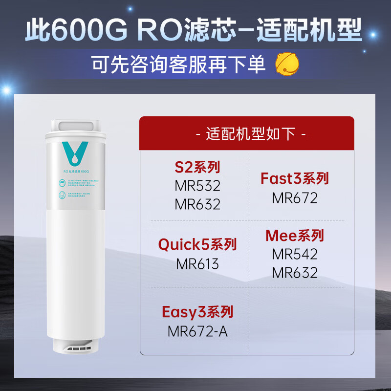 云米(VIOMI) 升级款云米净水器滤芯适配机型S2、Fast3、X2、Quick5、MeePlus、澎湃/Fast 1000G 2号RO膜(500/600G)价格:649.00元!