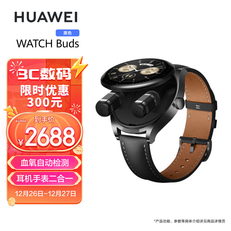 华为HUAWEI WATCH Buds 黑色真皮表带 47mm表盘 华为运动智能手表 手表耳机二合一 AI降噪通话 健康管理价格:2688.00元!