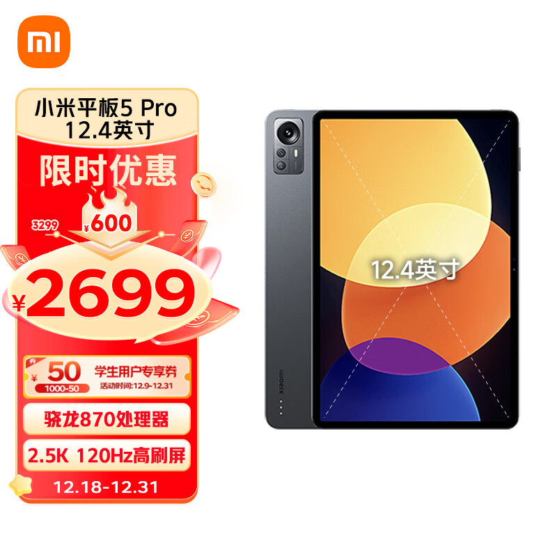 小米平板5Pro 12.4英寸 2.5K 120Hz高刷屏 骁龙870 12G+512GB 杜比影音娱乐办公网课学习平板电脑 (黑色)价格:2699.00元!