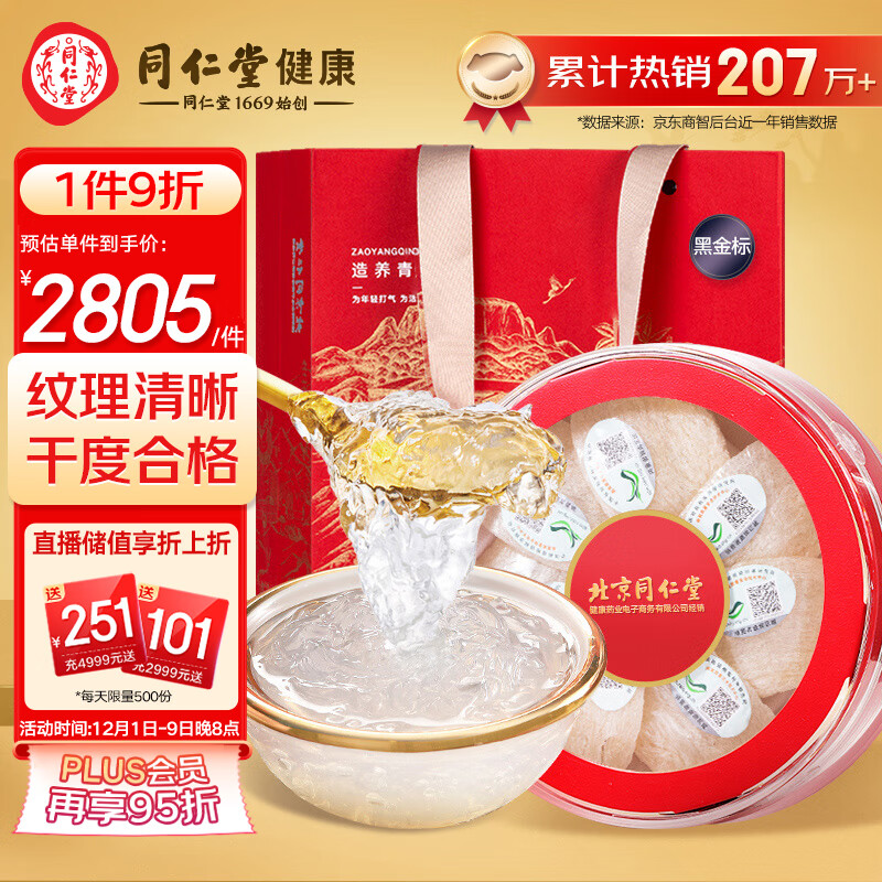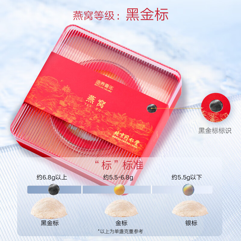 北京同仁堂 造养青年燕窝(黑金标款)50克 干燕窝大盏每盏约6.8g 孕妇滋补 马来西亚原产 送礼盒价格:3116.00元!