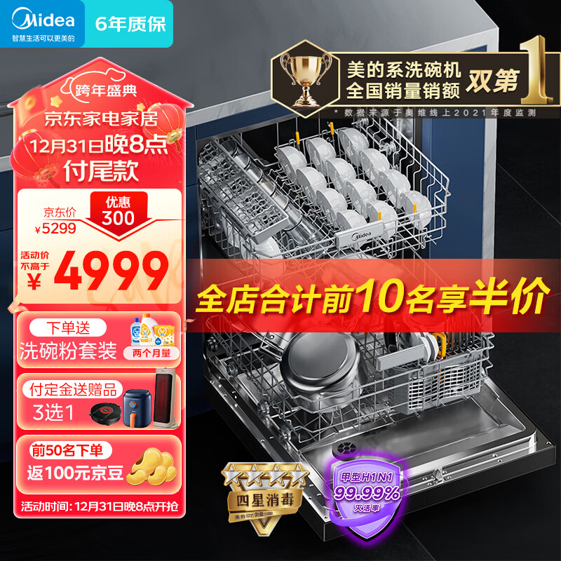 美的(Midea)万向2000洗碗机嵌入式14套大容量105℃热风烘干四星消毒一级水效168h存储变频万向星河黑色价格:4999.00元!
