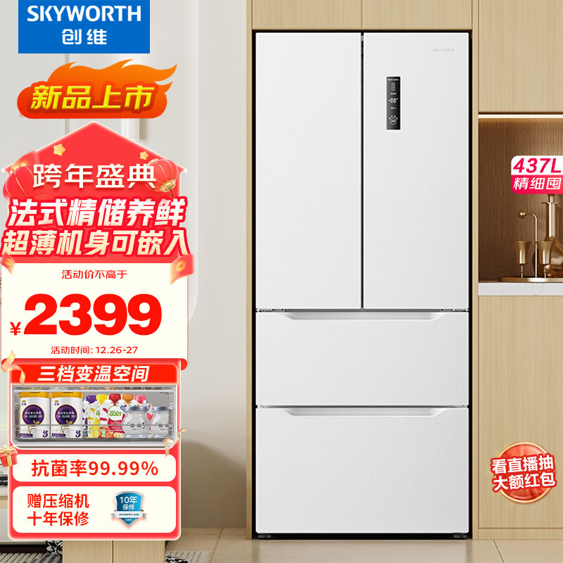 创维437升白色法式多门四开门对开门家用电冰箱风冷无霜一级能效双变频 超薄 变温空间BCD-437W4DB1价格:2399.00元!
