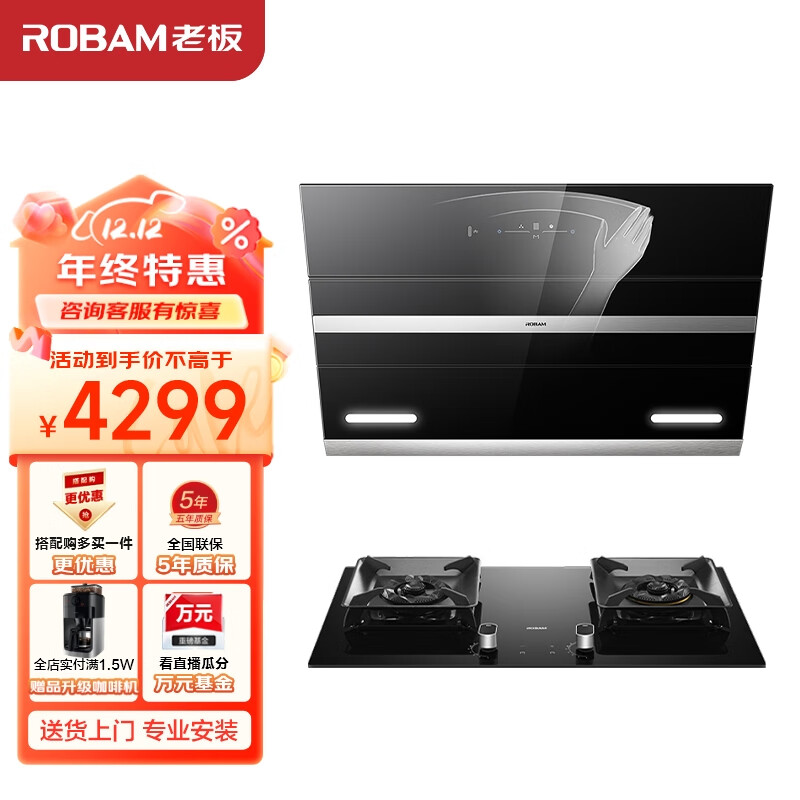 老板Robam抽油烟机烟灶套装免拆洗静音侧吸油烟机21风量燃气灶家用吸油烟机灶具27A3H+57B8AY液化气价格:4298.00元!