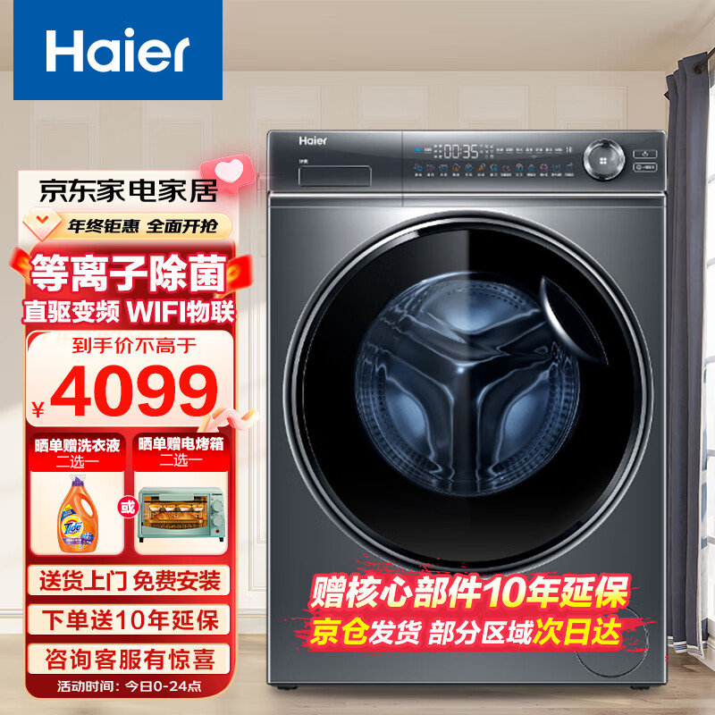 海尔(Haier)10KG滚筒洗衣机全自动家用大容量纤薄离子除菌直驱变频一级能效真丝精致洗XQG100-B14376LU1[家电]价格:4099.00元!