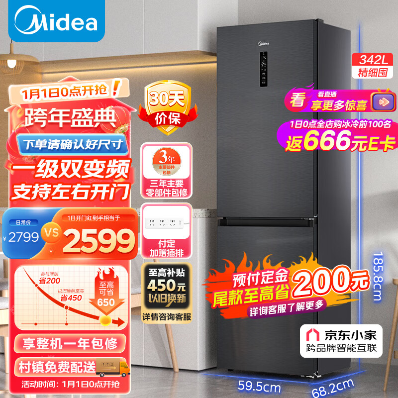 美的(Midea)342升一级双变频两门二门双门支持左右开门风冷无霜小型家用电冰箱大容量BCD-342WPZM(E)京东小家价格:2599.00元!