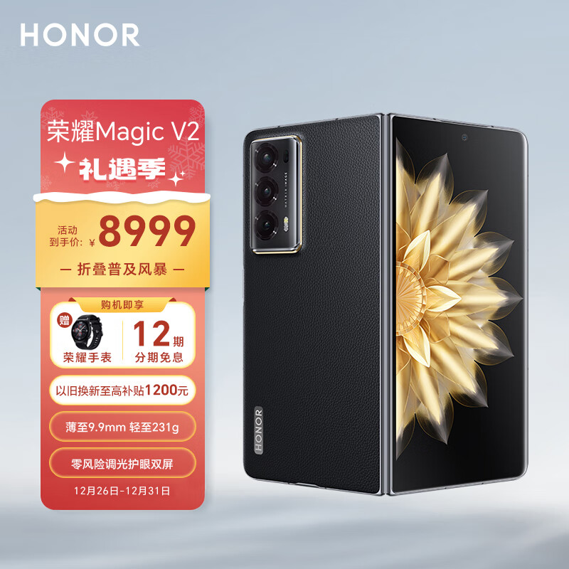 荣耀Magic V2 折叠屏 9.9mm超轻薄 零风险调光护眼双屏 5000mAh青海湖电池 5G 16GB+256GB 雅黑色价格:8999.00元!